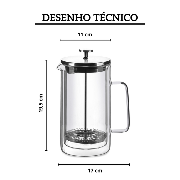 A Cafeteira Francesa Oxford possui estrutura robusta com parede dupla em vidro borosilicato, acabamento em inox e capacidade generosa de 1 litro. Suas dimensões são ideais para preparar café para várias pessoas, mantendo a bebida quente por mais tempo.