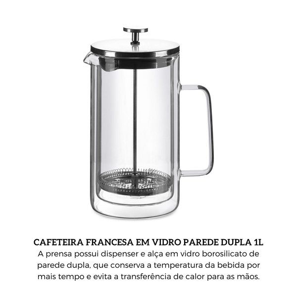 Cafeteira Francesa Oxford Vidro Parede Dupla Inox 1L Prateada ▾