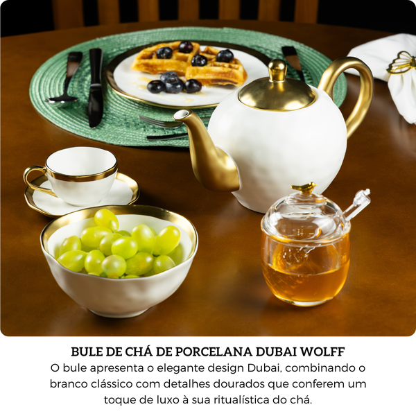 O Bule de Chá Wolff Dubai em porcelana branca com detalhes dourados traz sofisticação e elegância para a mesa posta, ideal para quem aprecia servir com requinte. Com capacidade de 1 litro, proporciona praticidade ao preparar e servir chá, sendo perfeito para reuniões especiais ou para transformar o dia a dia em um momento único.
