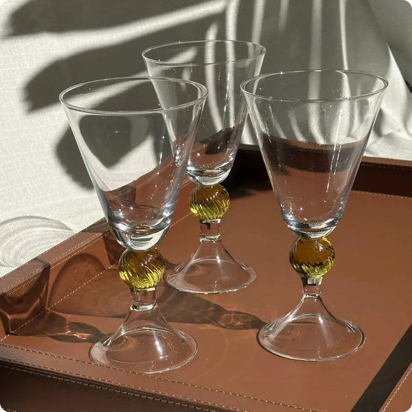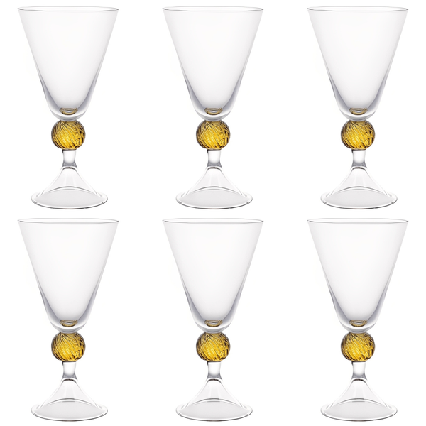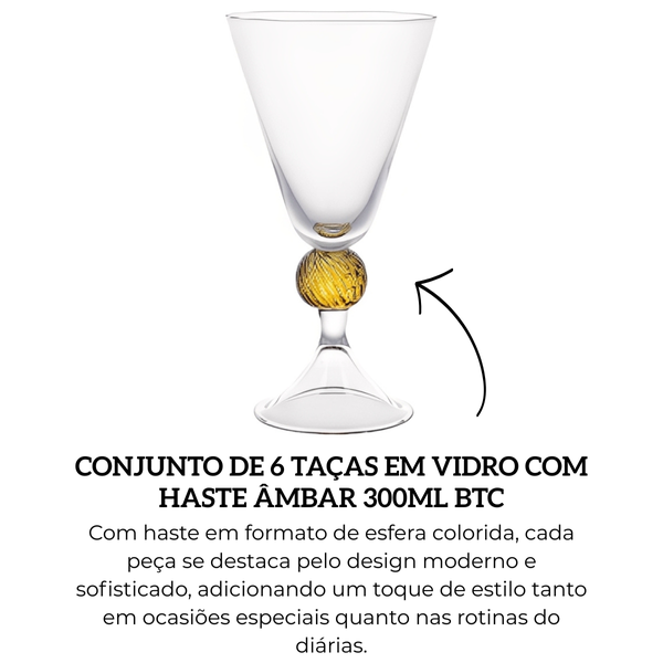 Este Conjunto De 6 Taças Em Vidro Com Haste Âmbar 300Ml é a escolha ideal para quem busca elegância e originalidade na hora de servir. Com haste em formato de esfera colorida, cada peça se destaca pelo design moderno e sofisticado, adicionando um toque de estilo tanto em ocasiões especiais quanto nas rotinas do diárias.