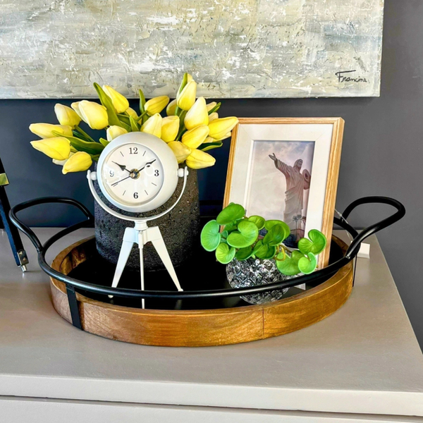 Conjunto de bandejas em madeira e metal preta com design moderno e funcional. Possuem base de madeira resistente e estrutura de metal pintado na cor preta fosca, garantindo firmeza, durabilidade e um visual sofisticado. Ideais para servir bebidas, aperitivos ou para compor a decoração com velas, vasos e objetos decorativos, levando praticidade e elegância para qualquer ambiente.