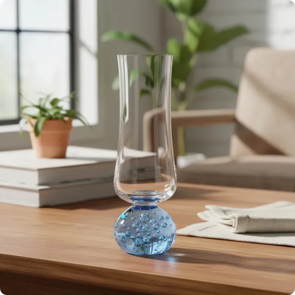 Feitas em vidro de alta qualidade, essas taças destacam-se pelo contraste entre a transparência e a base em azul, conferindo um toque de modernidade e estilo ao ambiente. Sua cor azul remete à serenidade e harmonia, ideal para composições contemporâneas e sofisticadas.