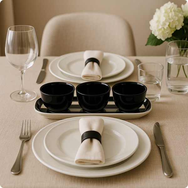 A decoração moderna em preto e branco com textura exclusiva harmoniza com diversos estilos de mesa posta.