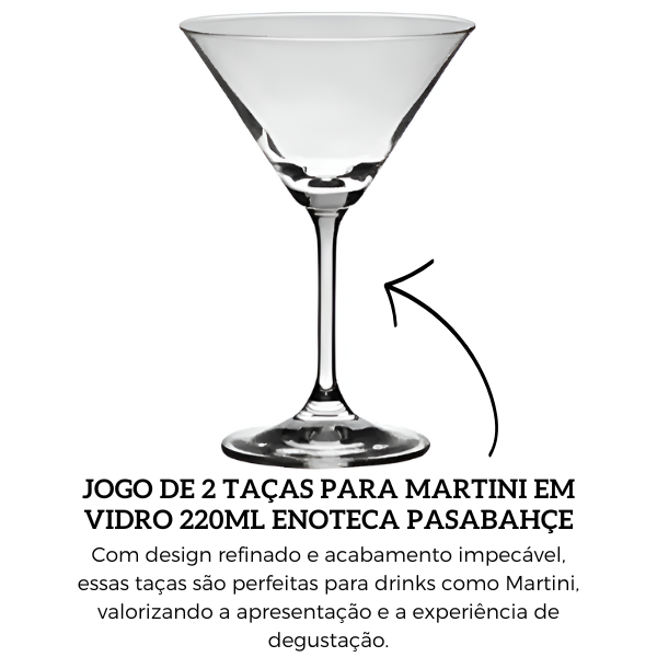 Este conjunto acompanha duas taças para martini, cada uma com 220ml de capacidade, perfeitamente dimensionadas para drinks sofisticados. Fabricado em vidro transparente de alta resistência, o produto une elegância e durabilidade, fundamental para quem busca acessórios para cozinha de qualidade.