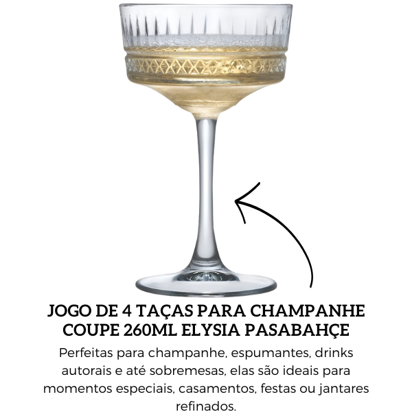 O Jogo de 4 Taças para Champanhe Coupe Pasabahçe em vidro de 260ml é sinônimo de elegância para quem deseja surpreender em ocasiões especiais. Com design inspirado no charme vintage das taças coupe, proporciona requinte para servir champanhe, espumantes, drinks sofisticados ou até sobremesas em festas, casamentos ou jantares intimistas.