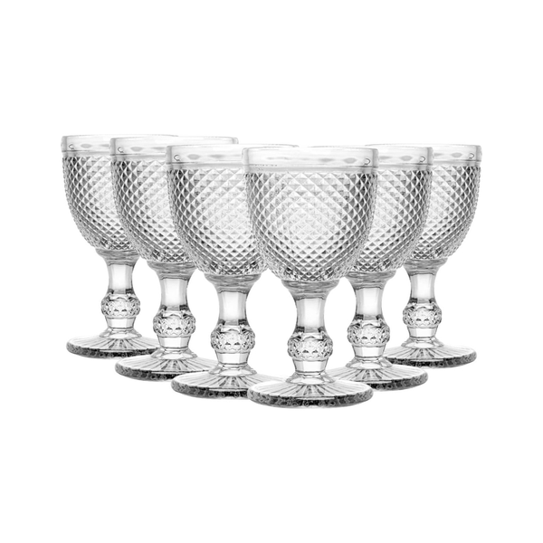 Conjunto de taças de vidro transparente com relevo geométrico, que une resistência e sofisticação. O acabamento texturizado no bojo proporciona charme extra e um visual requintado para qualquer ocasião. Ideal para servir água, sucos, vinho ou até mesmo drinques, essas taças valorizam tanto o dia a dia quanto recepções especiais.
