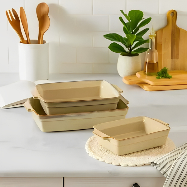 O conjunto de travessas retangulares de cerâmica bege é perfeito para quem busca unir elegância, praticidade e durabilidade no dia a dia. Composto por 3 peças de diferentes tamanhos, permite preparar, assar e servir diretamente à mesa com estilo. Produzidas em cerâmica de alta qualidade, oferecem resistência ao calor, preservam melhor a temperatura dos alimentos e garantem um cozimento uniforme. Seu design retangular com bordas e alças laterais facilita o manuseio, enquanto o acabamento em tom bege neutro combina com qualquer ambiente ou composição de mesa posta. Ideal para lasanhas, assados, sobremesas ou entradas, é indispensável em cozinhas modernas e funcionais.