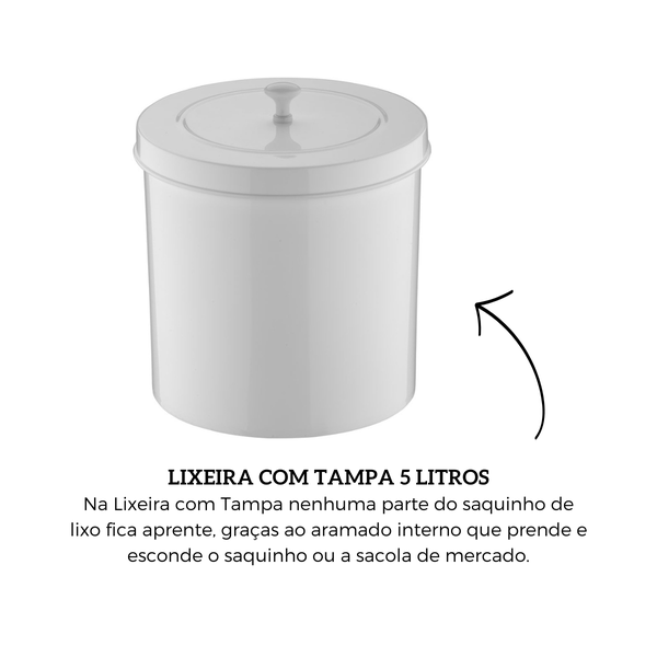 A lixeira possui um design moderno com capacidade de 5 litros, perfeita para banheiros. Inclui um aramado interno para fixação dos sacos de lixo.