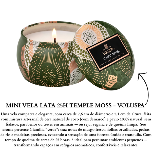 A Mini Vela Lata 25H Temple Moss – Voluspa é uma verdadeira joia aromática, combinando sofisticação, frescor e design impecável em um formato compacto e versátil. Uma escolha consciente para quem valoriza qualidade e responsabilidade. A Mini Vela Lata 25H Temple Moss – Voluspa é perfeita para presentear em datas especiais ou para elevar a decoração e o aroma do seu espaço com requinte e personalidade.