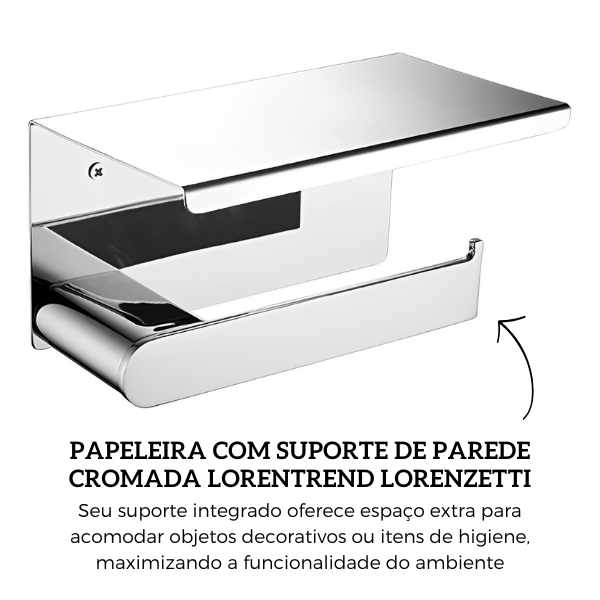 A Papeleira Cromada Lorenzetti LorenTrend com Suporte de Parede agrega sofisticação e funcionalidade ao seu banheiro, combinando design contemporâneo e acabamento premium. Com espaço extra para acomodar objetos decorativos ou itens de higiene, este acessório otimiza o uso do ambiente, mantendo elegância e praticidade.