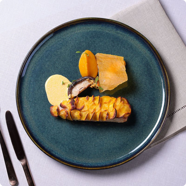 O formato generoso e redondo favorece a apresentação dos pratos, ideal para refeições completas e sofisticadas.