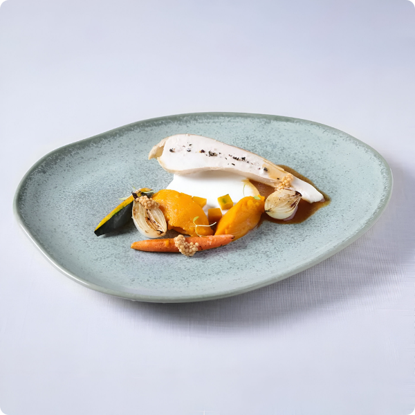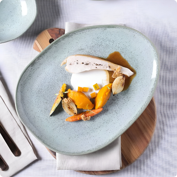 O formato oval, bordas levemente irregulares e a coloração verde granite tornam cada prato único e diferenciado.
