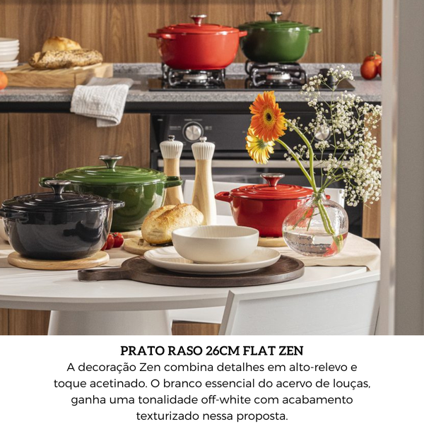 O Prato Raso Flat Zen foi desenvolvido para garantir durabilidade, beleza e funcionalidade. Suas especificações abrangem materiais nobres, dimensões ideais e praticidade para o uso doméstico.