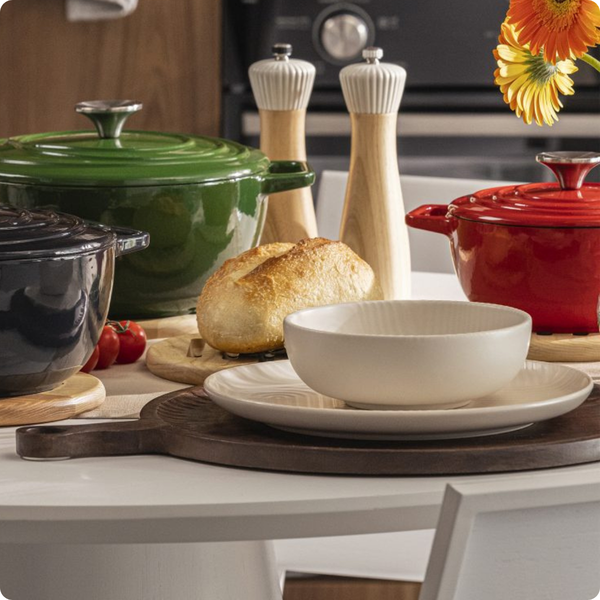 Combinação moderna e neutra, perfeita para compor diferentes acessórios para cozinha e jogos de jantar.