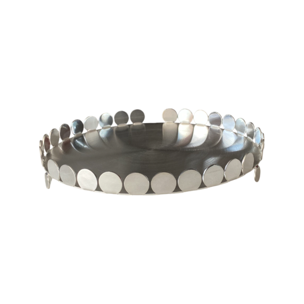 A Salvinha Riva Nanna Redonda Grande Inox Revestida em Prata é um acessório para cozinha e mesa que une sofisticação e funcionalidade. Com design refinado, acabamento impecável e materiais de alta qualidade, ela valoriza decorações e agrega elegância ao servir petiscos e alimentos em ocasiões especiais ou no dia a dia.