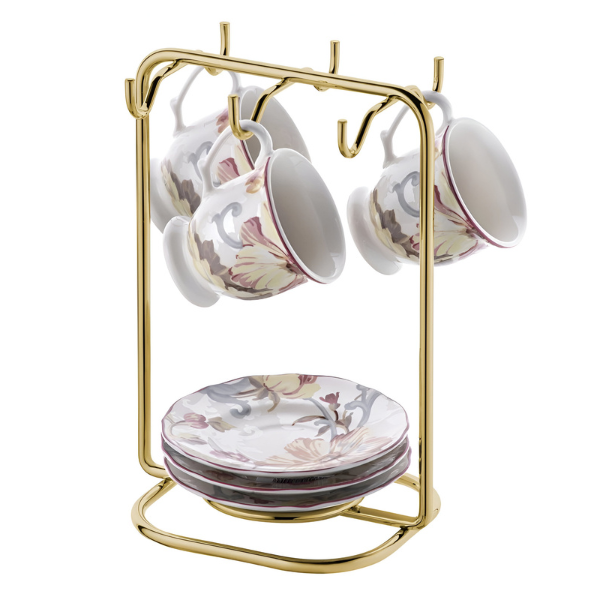 O Suporte para Xícaras e Pires de Café Dourado Caffè Future é a solução ideal para quem busca praticidade e charme na hora de organizar sua coleção de xícaras. Com um design elegante e acabamento dourado moderno, ele transforma qualquer cantinho do café em um espaço sofisticado e funcional.