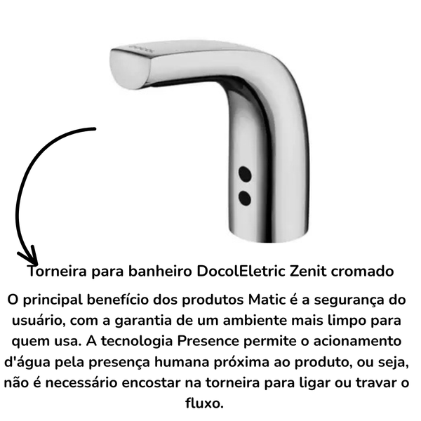 A Torneira para banheiro DocolEletric Zenit cromado une inovação, design moderno e praticidade em um só produto. Seu acionamento eletrônico por toque garante uma experiência intuitiva e tecnológica, proporcionando economia de água e maior higiene no dia a dia. O acabamento cromado de alta resistência confere brilho intenso e durabilidade, mantendo a peça sempre elegante mesmo após anos de uso. Com linhas sofisticadas e um estilo contemporâneo, ela transforma o ambiente em um espaço funcional e requintado, ideal para quem busca unir conforto, estética e tecnologia de ponta no banheiro.