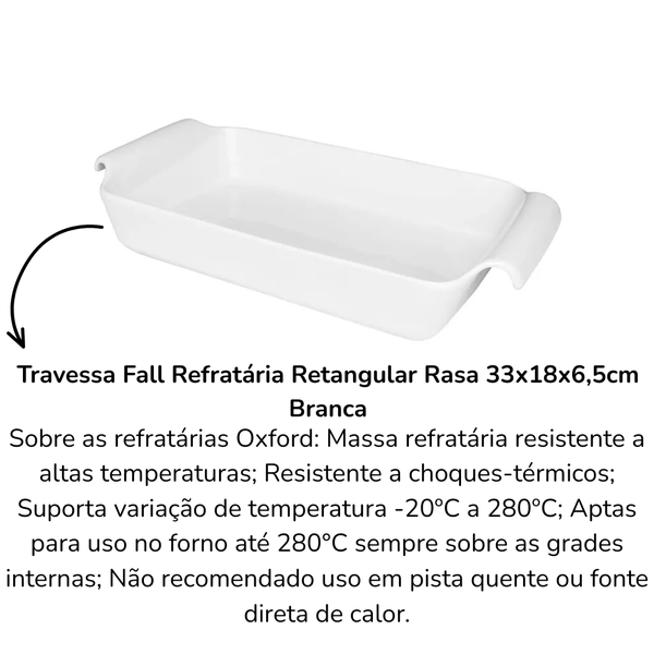 Travessa Fall Refratária Retangular Rasa 33x18x6,5cm Branca