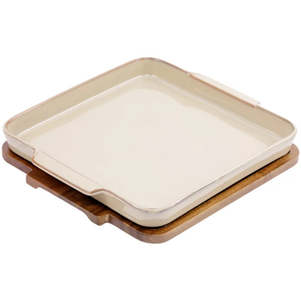 Travessa quandrada de cerâmica bege com madeira BTC