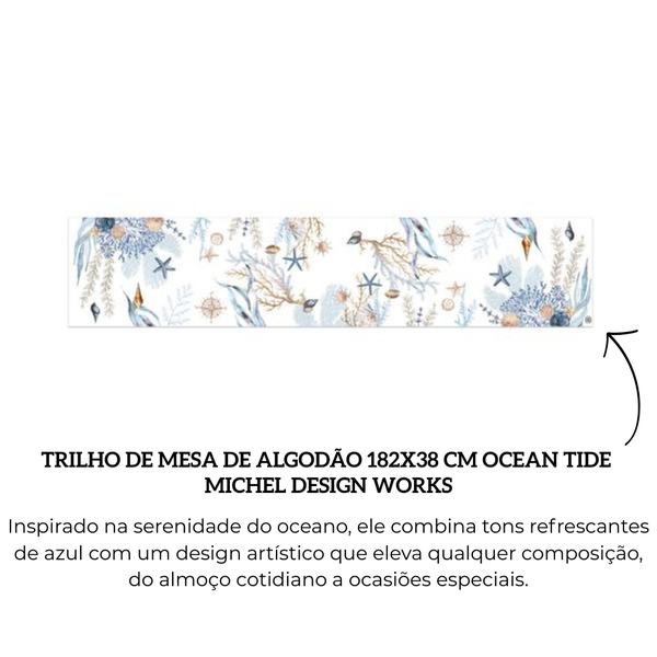 Transforme sua mesa com o charme sofisticado do Trilho de Mesa Ocean Tide, assinado pela renomada Michel Design Works. Inspirado na serenidade do oceano, ele combina tons refrescantes de azul com um design artístico que eleva qualquer composição — do almoço cotidiano a ocasiões especiais. Confeccionado em algodão premium, o trilho oferece toque macio, excelente caimento e resistência ao uso diário. O tecido natural garante conforto visual e durabilidade, mantendo a beleza mesmo após várias lavagens.