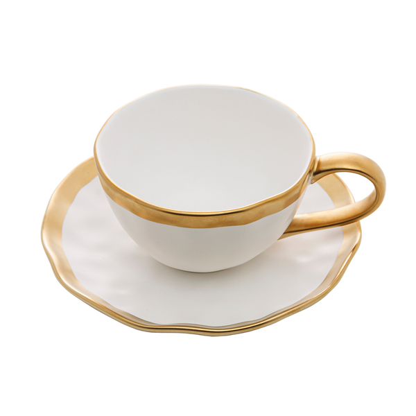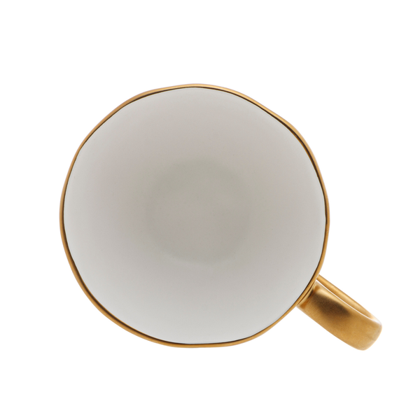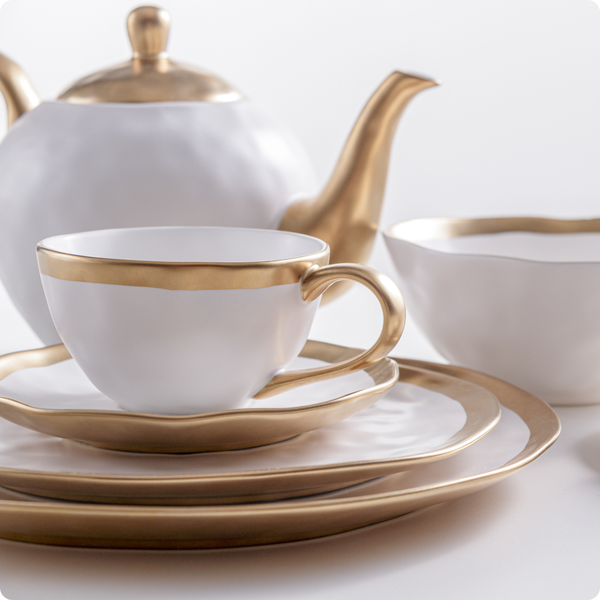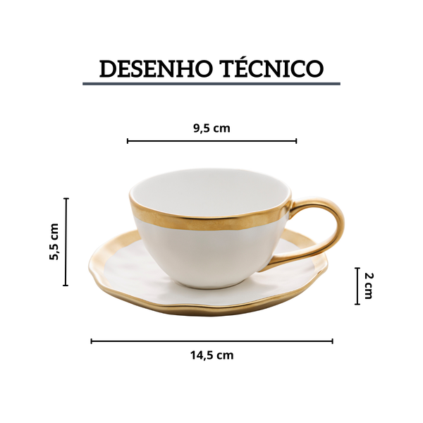 O toque dourado em alça, borda e pires destaca a peça, elevando o nível de sofisticação.